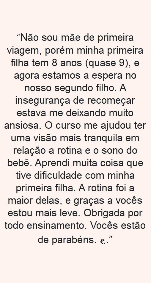 Então, se você não apenas quer educar o sono do seu bebê desde os primeiros dias, mas também quer ter mais saúde e tranquilidade com dias organizados, basta clicar no botão abaixo para conhecer mais sobre a nossa metodologia.